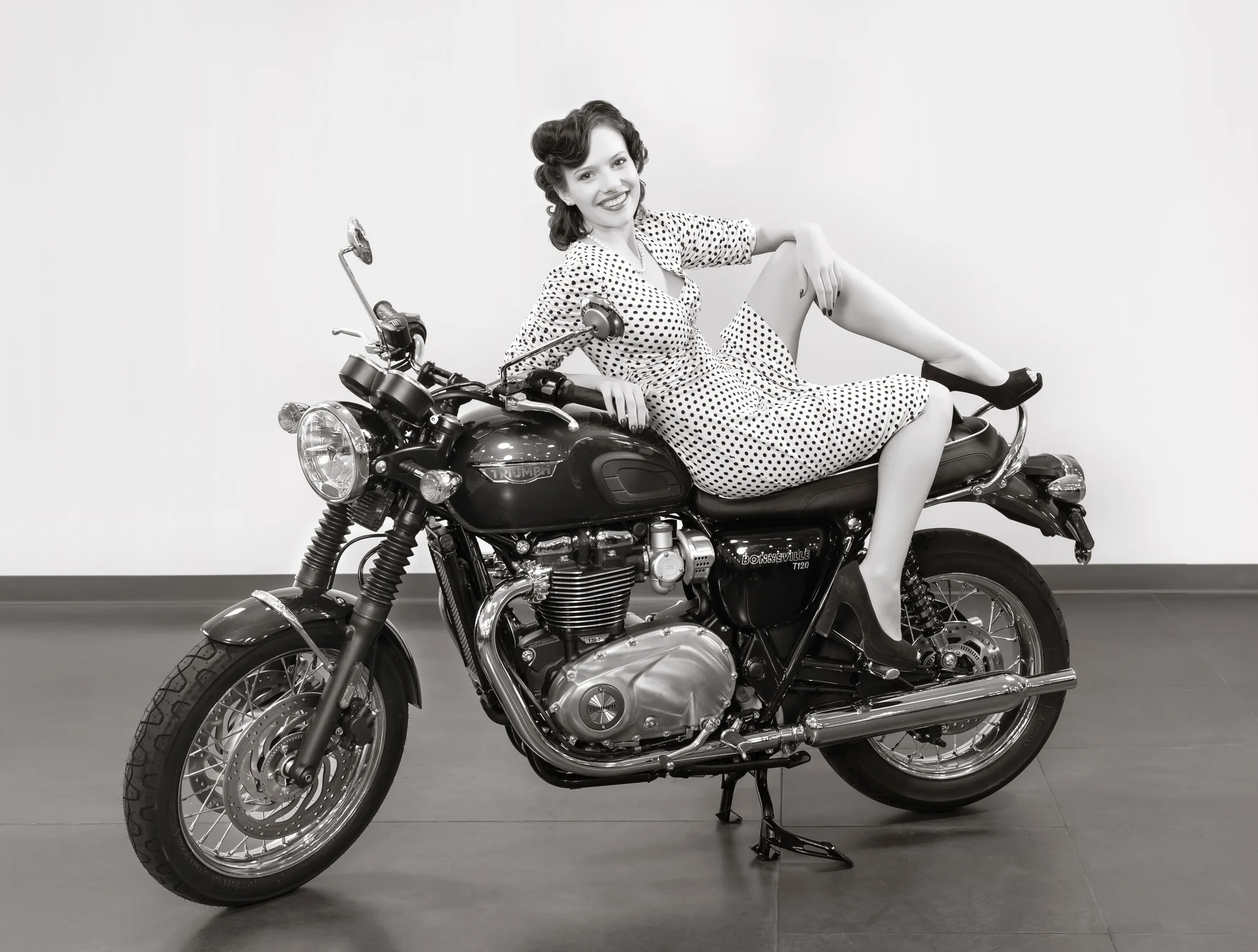In 1953, Marlin Brando stared in a film, "Wild One," about a motorcycle gang. The motorcycle Mr Brando rode in the film was a British made Triumph. Later in 1959, the famous Triumph Bonneville was born, named after the famous Bonneville Salt Flats in Utah. Today, the Triumph Bonneville has been resurrected as a modern motorcycle. The '50s era Bonneville was the theme for this vintage styled photo shoot. Our models, Madyson Wilmot and Bradley Perkins.